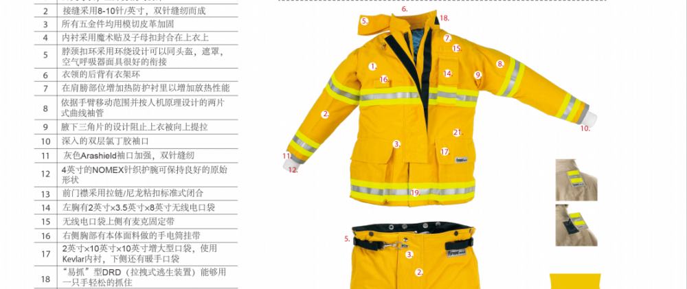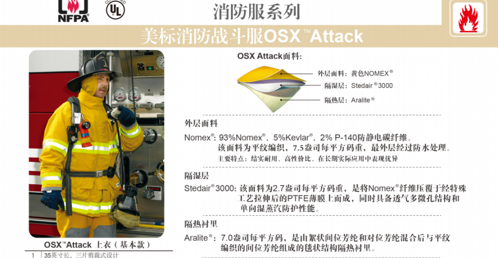 面料结构:Nomex IIAI : 93%Nomex 5%Kevlar. 2% P-140防静电碳纤维。雷克兰Attack美标消防战斗服该面料为平纹编织,7.5盎司每平方码重,最外层经过防水处理。 Stedair *3000:该面料为5.2盎司每平方码重,是将Nomex纤维压覆于经特殊工艺拉伸后的PTFE薄膜上面成,同时具备透气多微孔结构和单向湿蒸汽防护性能。